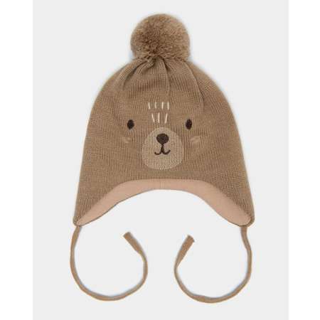 Шапка для мальчика Baby Go бежевого цвета, декорированная вышивкой и помпоном.