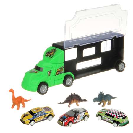 В комплект входят один большой фургон, 3 машинки и 3 динозаврика.