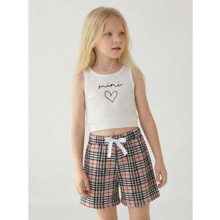 Комплект кроп-топ и шорты для девочки молочного цвета. Изготовлено из ткани рибана 100% хлопок. Топ-майка с небольшим принтом. Пояс шорты - эластичная резинка со шнурком.