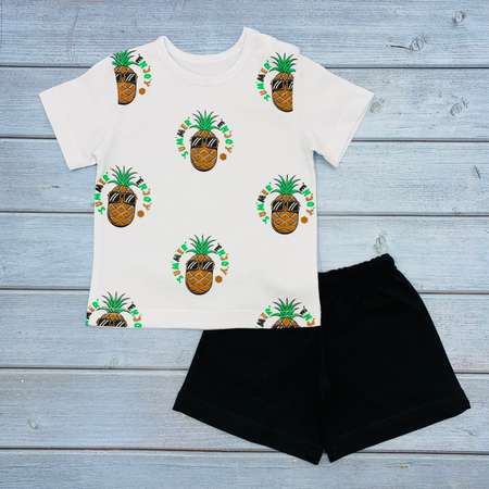 Комплект для малыша из 100% хлопка с оригинальным принтом. В комплект в ходит футбока для мальчика с коротким рукавом и шорты. Ткань кулирная гладь из легокого трикотажного полтона. Сделано в России.
