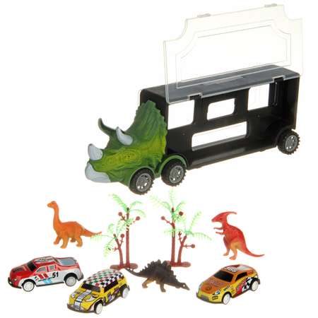 В наборе автовоз, 3 машинки, 3 фигурки динозавров, 2 фигурки пальм. 9 предметов.