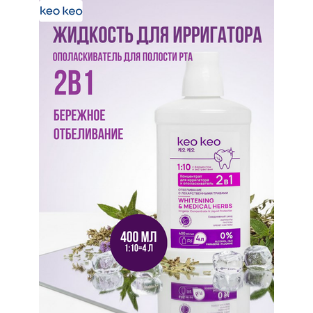 Концентрат для ирригатора и Ополаскиватель 2 в 1 Отбеливание КЕО КЕО, 400мл. Жидкость для ирригатора - это антибактериальный концентрат, который специально разработан для ухода за полостью рта. Средство предназначено для ополаскивания и гигиены зубов, при этом его можно использовать как в качестве ухода, так и в качестве раствора для ирригатора. Безопасное средство на каждый день для ухода без фтора, без спирта, без SLS и без парабенов защищает полость рта и межзубное пространство от бактерий на 24 часа. Экстракты целебных растений (мяты, мелиссы, тархуна, имбиря, белого чая, зеленого чая) нейтрализуют воздействие вредоносных бактерий, способствует уменьшению воспаления и кровоточивости десен. Карбамида пероксид, Папаин в оптимальном % содержании бережно удаляют пигментированный налет с эмали. Ксилит борется с очагами размножения микроорганизмов и связанными с ними воспалительными процессами, уменьшает риск возникновения кариеса, сохраняет свежесть дыхания. Регулярная забота о зубах борется с первыми признаками пародонтоза, устраняет неприятный запах изо рта обладателям несъемных протезов, имплантантов, брекетов. Профилактика заболевания зубов с помощью ирригатора: поддержание чистоты и борьба с болезнетворными микробами; предотвращение появления кариеса, устранение кровоточивости и снятие воспаления. Ментол, длительное время придает дыханию свежесть. Жидкость для ирригатора – это косметическое средство по уходу за полостью рта устраняет кровоточивость десен; профилактика камнеобразования; противовоспалительное средство. Рекомендуем использовать в качестве средства антиналет, антитабак для ежедневной гигиены полости рта.