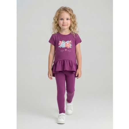 Детали: туника для девочки расширенная к низу, с милым воланом, круглым вырезом горловины, коротким рукавом и принтом; облегающие длинные легинсы в поясе с эластичной тесьмой.