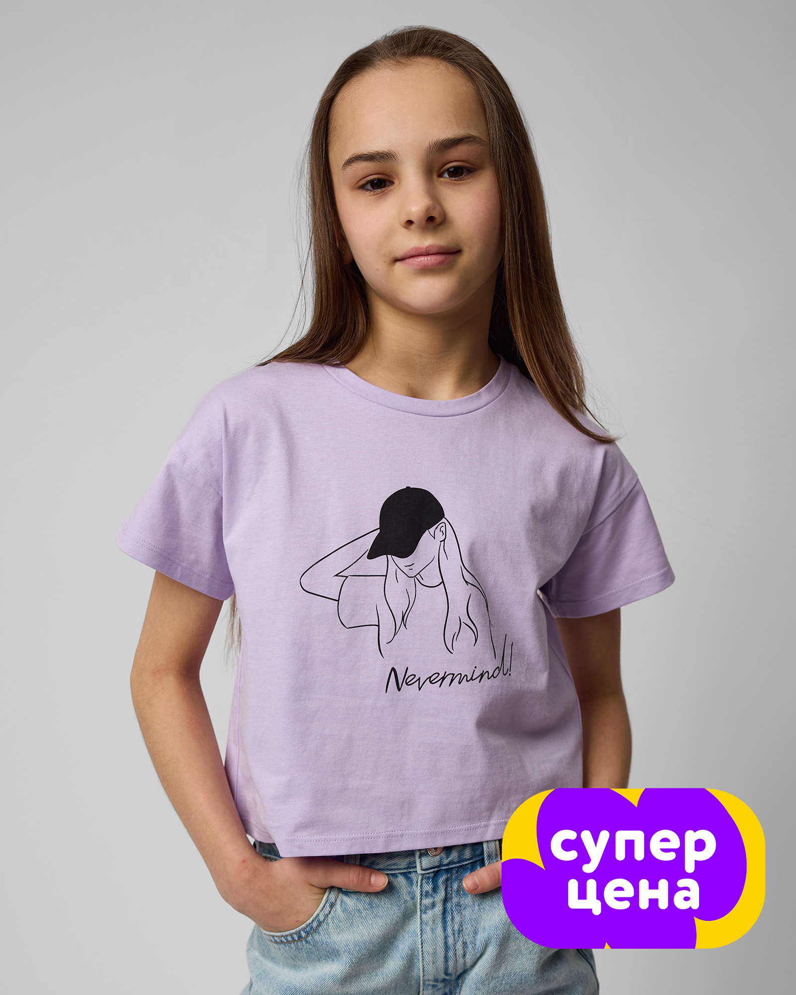 Укороченная фиолетовая футболка для девочки Futurino с однотонным принтом "Nevermind!".