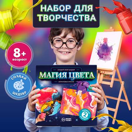 Хотите увлечь ребёнка творчеством? Большой подарочный набор для творчества для девочек и мальчиков «Магия цвета» станет Вашим помощником. Это детский набор для рисования красками, в котором всё происходит, как в настоящей лаборатории. Ребёнок самостоятельно создаст краски из пигментов, а затем зальёт ими картину в технике Fluid Art — без кистей, без шаблонов, только воображение и волшебство цвета.
