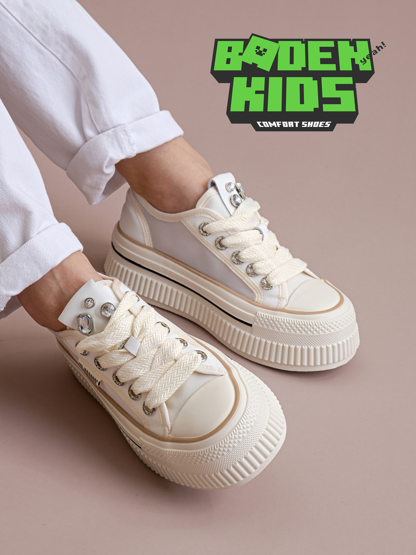 Оригинальные кеды на платформе украсят гардероб Вашего ребенка и помогут создать множество ярких образов в новом сезоне. Обувь отлично сочетается с вещами разных фасонов и оттенков. Несмотря на лаконичный дизайн и классический силуэт, модель смотрится необычно за счет высокой подошвы. Модные тряпочные конверсы идеально дополнят наряд в стиле casual и актуальный спортивный аутфит. . Мягкие и удобные кеды – практичная и универсальная обувь для девочек. Они подойдут для повседневного использования, школы, занятий физкультурой в помещении и на свежем воздухе, прогулок и игр в городе и на природе, путешествий и активного отдыха. Верх и подкладка модели выполнены из текстиля – материала, который обеспечивает оптимальный воздухообмен, не создавая эффекта прения. Он хорошо впитывает и испаряет влагу, что гарантирует приятный микроклимат внутри обуви и позволяет стопе «дышать». Легкая подошва с амортизацией обеспечит поддержку стопы и подарит комфорт и свободу движения. Коллекция детской обуви BADEN 2024 года включает в себя современные модели на любой вкус и на все случаи жизни. В широком ассортименте нашего магазина Вы найдете множество стильных вариантов как для повседневного использования, так и для торжественных случаев. В каталоге представлены классические, а также оригинальные и прикольные модели, созданные с учетом популярных трендов молодежной моды. В коллекции есть и универсальные модели, которые подойдут для прогулок, активного отдыха, а также в качестве сменки в школу. Важно, чтобы обувь была не только стильной, крутой и нарядной, но и безопасной и удобной. Модели бренда разработаны с учетом особенностей анатомии детской стопы и рекомендаций ортопедов. Амортизирующая подошва, эргономичная колодка, легкие дышащие материалы верха и подкладки гарантируют высокий уровень комфортности. В нашем магазине действуют акции, благодаря которым Вы можете сэкономить и купить обувь бренда дешевле. Следите за распродажами и скидками!