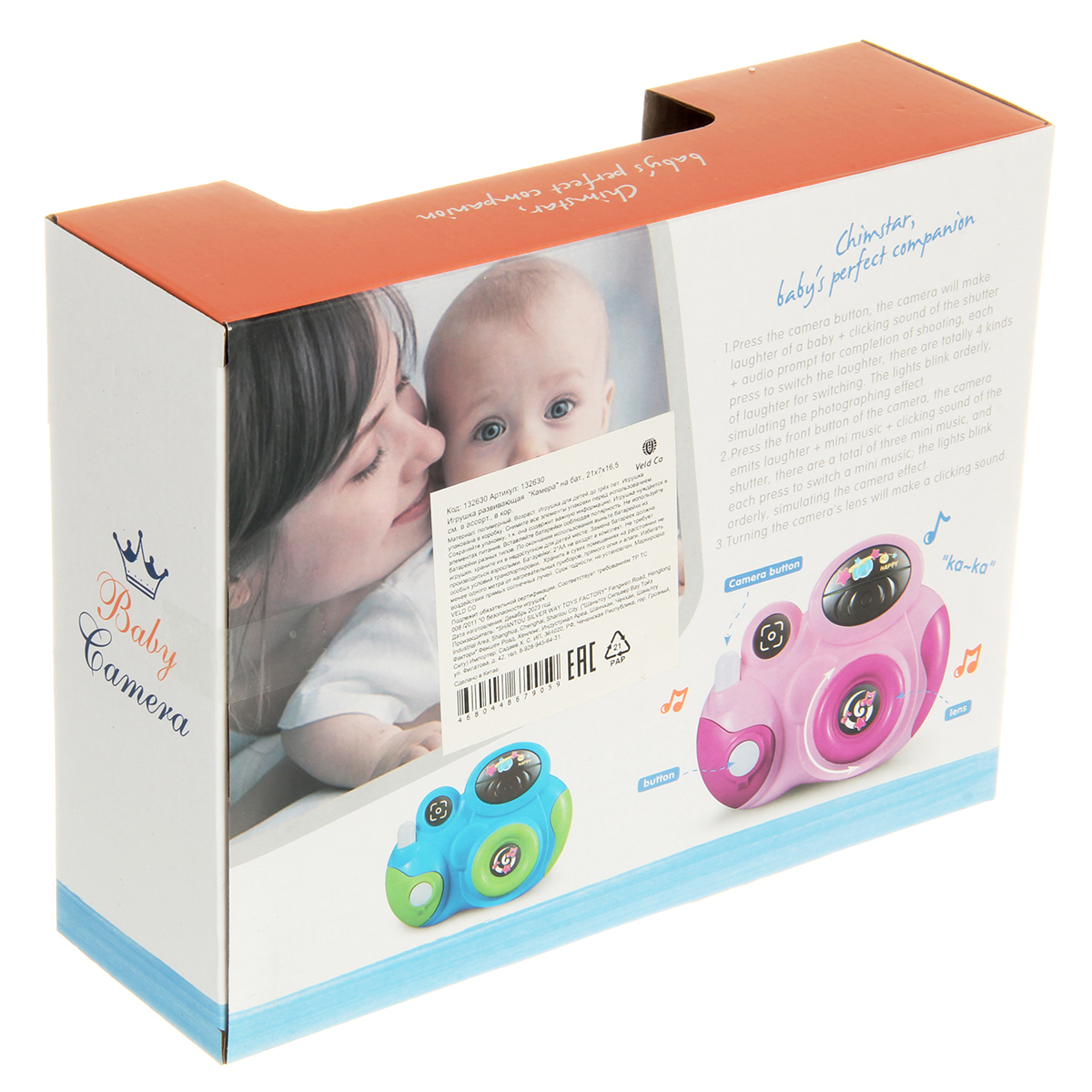 - Кнопка фотографирования, игрушка издает разные звуки смеха ребенка, звук фотографирования, подсветка вставки в верхней части и вставки в объективе.