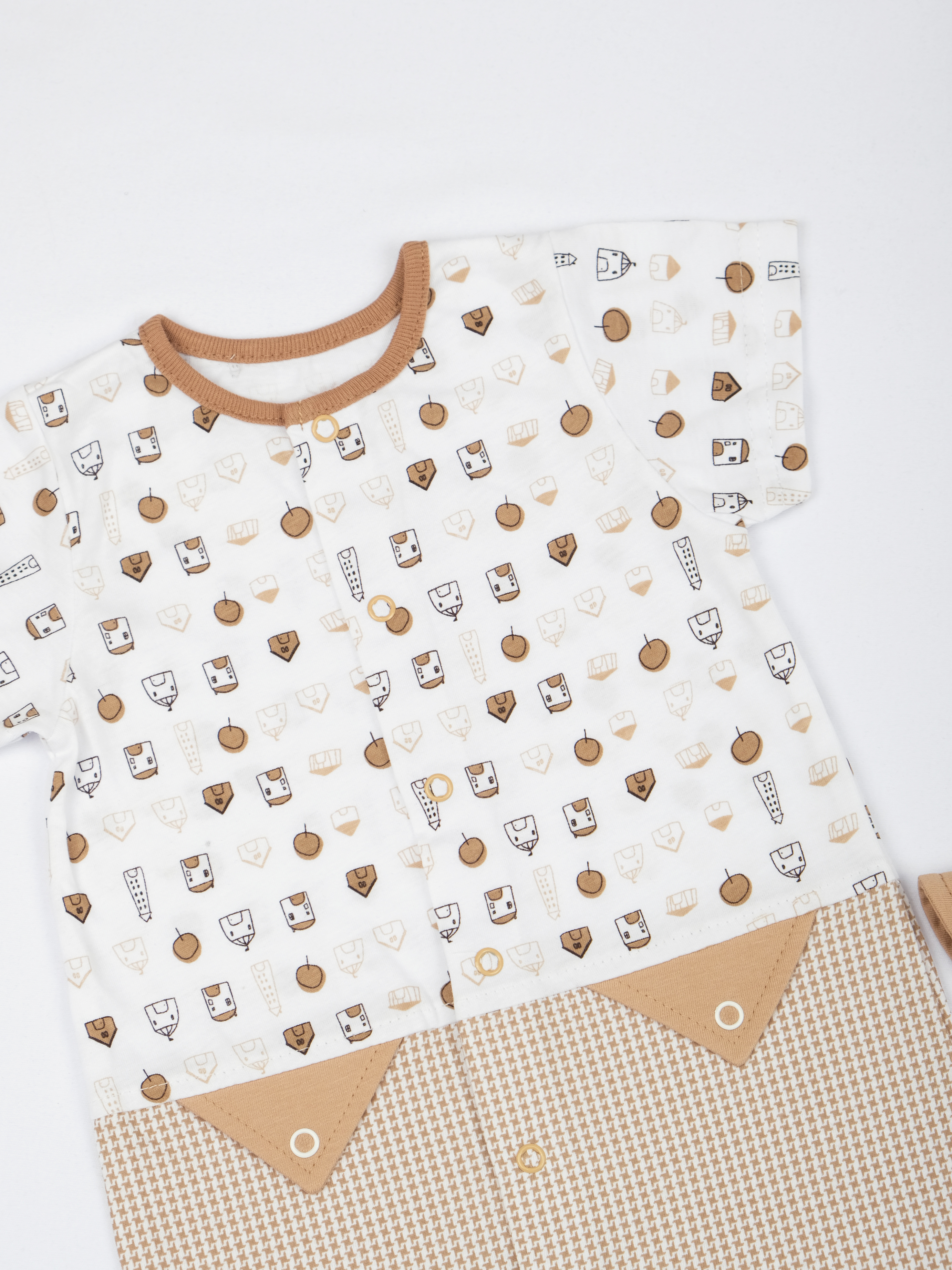 Легкий комплект из кулирного набивного полотна включает в себя комбинезон и кепку. Комбинезон выполнен из двух расцветок полотен. Застежка комбинезона на кнопочки от горловины до пяточек. Рукава короткие, как раз для жаркого лета. Кепочка сзади на резиночке, что позволяет удержать ее на голове.
