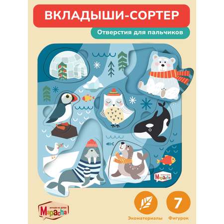 Этот деревянный сортер идеально подходит для малышей. Комплект игры включает рамку-основание с фигурными углублениями и семь вкладышей с изображением животных и птиц Арктики. Уникальный дизайн порадует яркими цветами, а каждая фигура выполнена из безопасного древесного материала