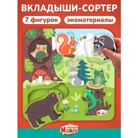 Деревянный сортер для малышей с рамкой основанием и фигурными вкладышами, изображающими животных леса, станет увлекательной и полезной игрой для детей от 3 лет. В комплект входят 8 ярких фигурок: сова, белка, енот, заяц, лягушка, ящерица и бурый медведь. Каждое углубление на основе снабжено удобным отверстием для пальчиков, что позволяет легко доставать элементы.