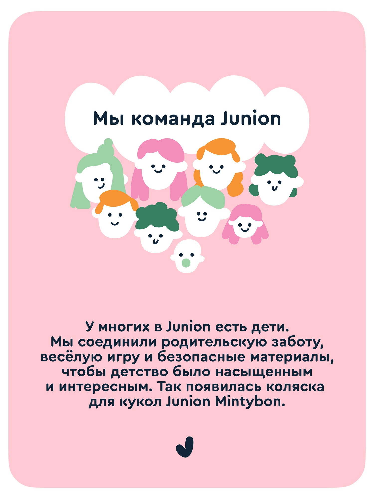 Junion Mintybon — это коляска для кукол, придуманная в Яндексе настоящими родителями.Это изящная ретро-копия настоящей коляски. Нежно-мятная, миниатюрная, но совсем как у взрослых: со съёмной люлькой, складным капюшоном ,чтобы игрушки могли спокойно посапывать во время прогулки, и большими бесшумными колёсами. В игрушечной коляске есть настоящая функция укачивания: чтобы приходили только приятные сны.Люлька поворачивается и устанавливается в двух положениях: лицом по ходу и против движения коляски. Вместительная: подходит и для пухлых плюшевых игрушек, и для кукол.Всё необходимое для прогулок с игрушечными друзьями поместится в корзинке для мелочей.Игрушка подходит для совместных игр с друзьями и родителями. Развивает социальные навыки малыша, тренирует воображение и учит заботиться о близких.Игрушечную коляску удобно хранить — она компактно складывается и не занимает много места. Выполнена из безопасных нетоксичных материалов и приятной ткани.