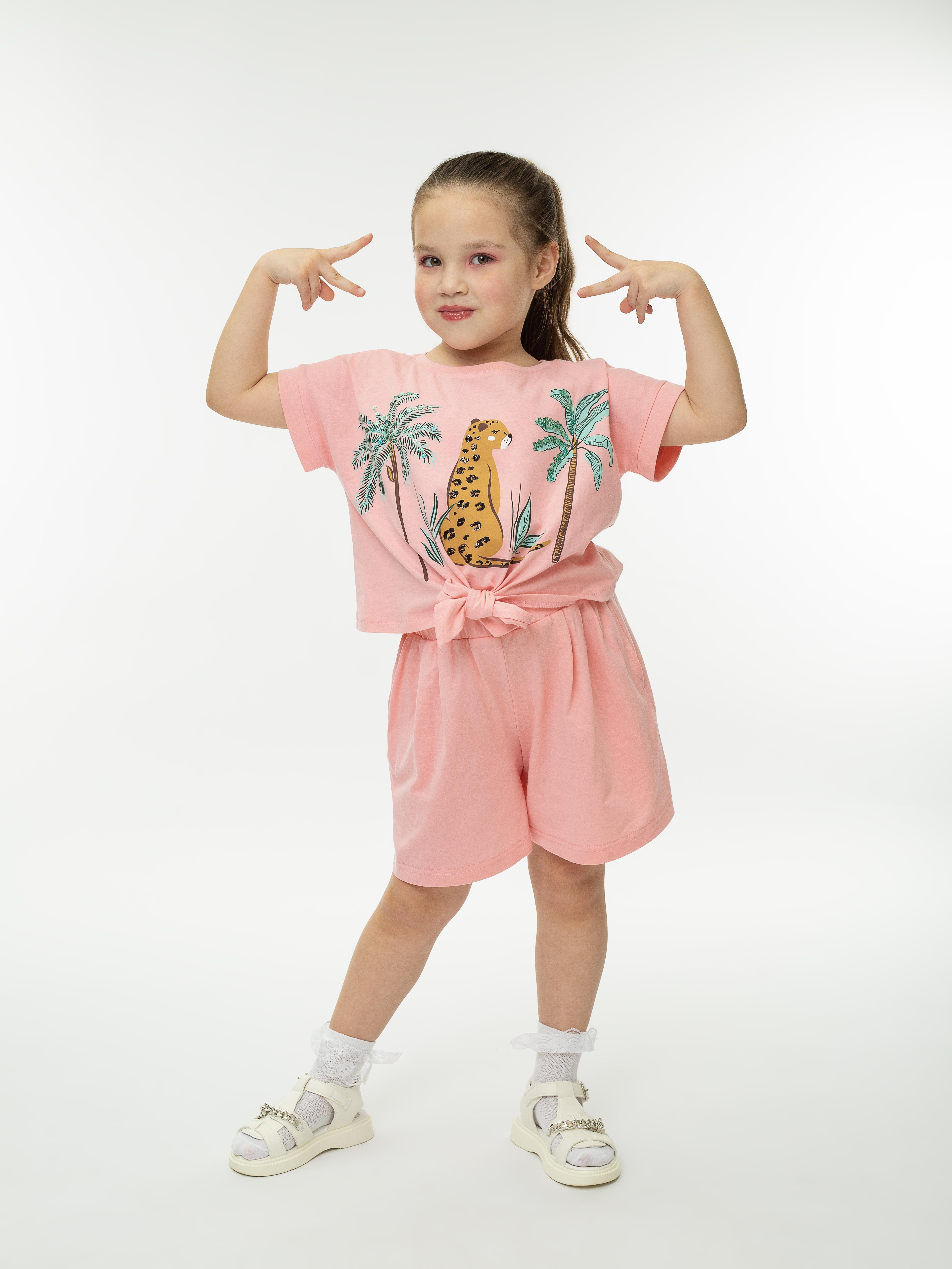 Летний костюм для девочки выполнен из качественного трикотажа (100% хлопок). Материал невероятно мягкий на ощупь, создает ощущение легкости при носке. Стильная футболка прямого кроя с коротким рукавом, оригинальным дизайном модели и интересным принтом. Шорты с двумя боковыми карманами и поясом на резинке. Костюм шорты и футболка будет хорошим подарком для девочки, понравится детям различного возраста: малышам и подросткам. Позвольте вашей девочке почувствовать себя стильной!