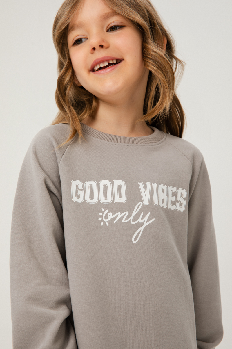 Платье свитшот для девочки из хлопкового футера без начеса, со стойким принтом Good Vibes Only. По горловине, низу изделия и низам рукавов резинка кашкорсе. Модель прямого силуэта. Трикотажное платье из футера в стиле спортивном стиле обладает оптимальной длинной, а модный принт не полиняет после стирки. Данная модель очень практичная и универсальная - может быть так же стильным выбором для праздничных мероприятий. Кофта отлично подойдет для прогулки, носки в школу или детский сад и для спортивных мероприятий. Так же поддеть под платье маечку то прикид будет достаточно теплым чтобы носить и в зимний и в осенний период.