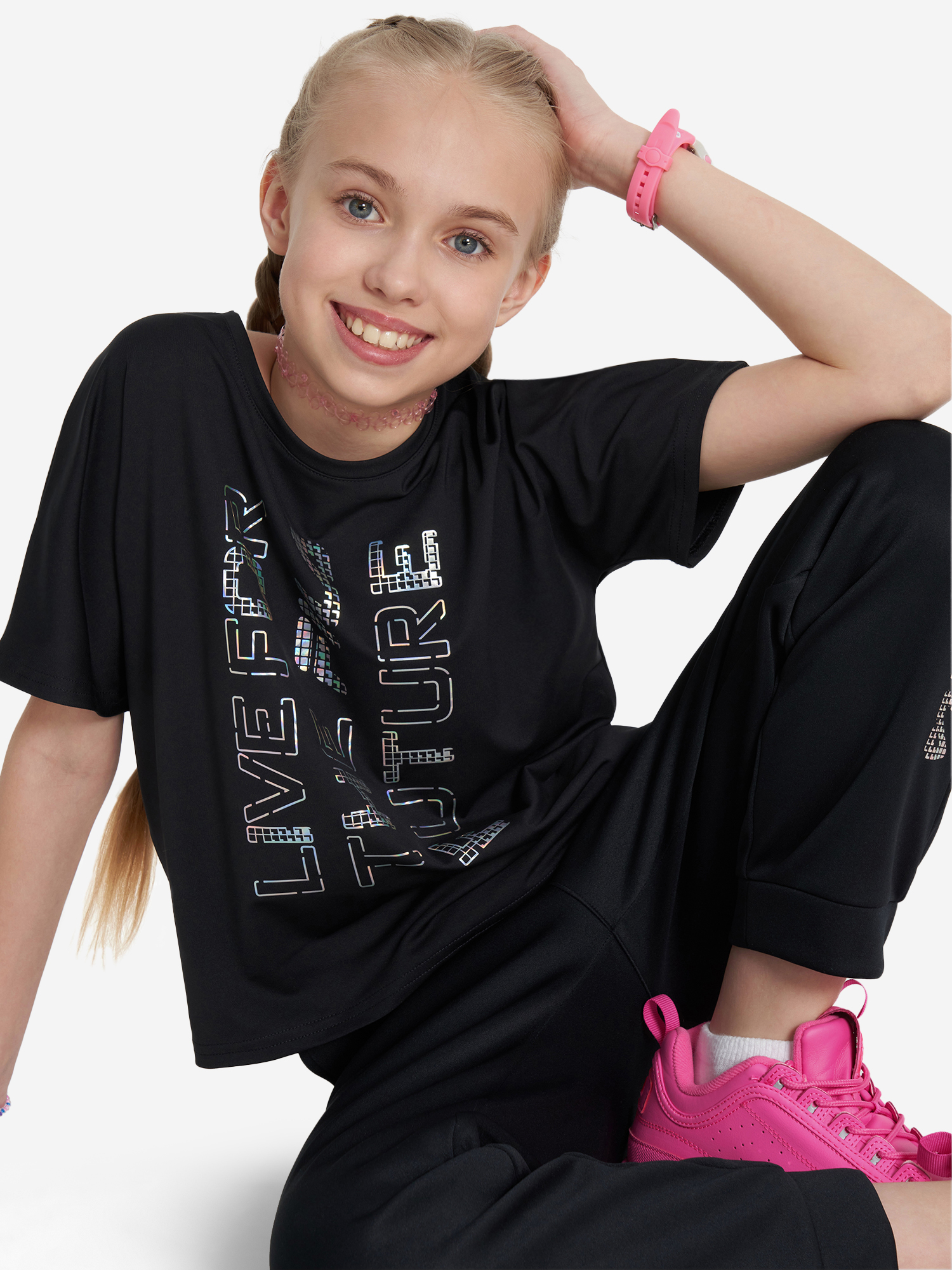 Футболка для девочки со свободным кроем гарантирует комфортную посадку, не сковывает движения и позволяет ребенку чувствовать себя уверенно в любой ситуации. Светоотражающий принт на спине не только добавляет стильный акцент, но и делает юную спортсменку более заметной на дороге в темноте.
