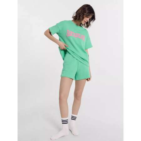 Пижама для женщин комплект с шортами и футболкой оверсайз из нежного хлопка от белорусского бренда Mark Formelle. Это идеальная вещь для любой девушки. Футболка с принтом оверсайз свободная, без воротника, короткими рукавами и немного спущенной линией плеча. Шорты свободные, с завышенной посадкой и резинкой внутри. Милая демисезонная модная летняя пижамка для отдыха, домашних дел и сна. Низ открытый, игривый, укороченная длина шорт добавляет изюминку всему комплекту. Одежда для дома, так же подойдет в отпуск и на прогулку. Романтический костюм с футболкой подойдет для беременных, в роддом кормящим и будущим мамам и на выписку, для девушек подростков, а также для взрослых женщин плюс сайз больших размеров. Стильный женский комплект из футболки с принтом и летних шорт отлично интегрируется в повседневный городской и пляжный образы. Большой размерный ряд позволяет подобрать размер для худых и полных, высоких и невысоких женщин. Пижама для беременных идет размер в размер.