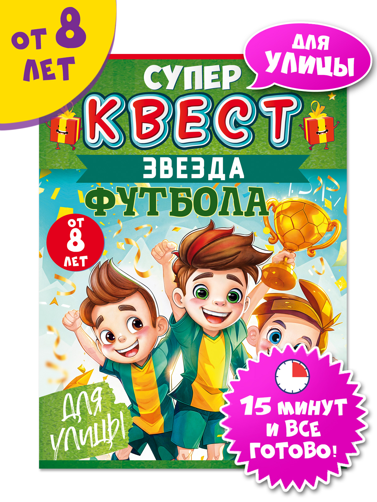 Увлекательные настольные игры в формате квеста – это отличная идея для детского времяпрепровождения! Тематические задания, загадки и головоломки нужно решать последовательно, чтобы в конце оказаться у заветного подарка. Совершайте захватывающие путешествия, не выходя из дома или двора!Квест «Звезда футбола» понравится детям, которые увлекаются спортом и, возможно, мечтают играть в настоящей сборной. Ведь по сюжету их как раз зовут присоединиться к команде начинающих футболистов. Смогут ли ребята выиграть матч с новым игроком?Такая развивающая игра для детей может порадовать в праздник или украсить обычный будний день вашей семьи. Вам нужно будет разложить готовые подсказки на улице (во дворе или на площадке) так, как указано в инструкции, и спрятать главный приз. Его можно украсить яркими наклейками и/или приложить удостоверение, бирку или медаль за прохождение квеста (входит в набор). Загадки, которые подростки будут решать по ходу прохождения, помогут им развить сообразительность, память, мышление и другие необходимые в жизни навыки, а также отлично и весело провести время!Квест объединяет в себе все, что любят дети и подростки, – поиск сокровищ, приключения и награду за преодоленные трудности! Головоломки можно проходить вместе со взрослыми, чтобы было веселее.Рассчитано на детей от 8 лет для игры на улице. В наборе: подробная инструкция, письма с заданиями, наклейки для конвертов и навигации, медаль и удостоверение. На подготовку уйдет всего 15 минут. Сам подарок в набор не входит.Цены в интернет-магазине могут отличаться от розничных магазинов.