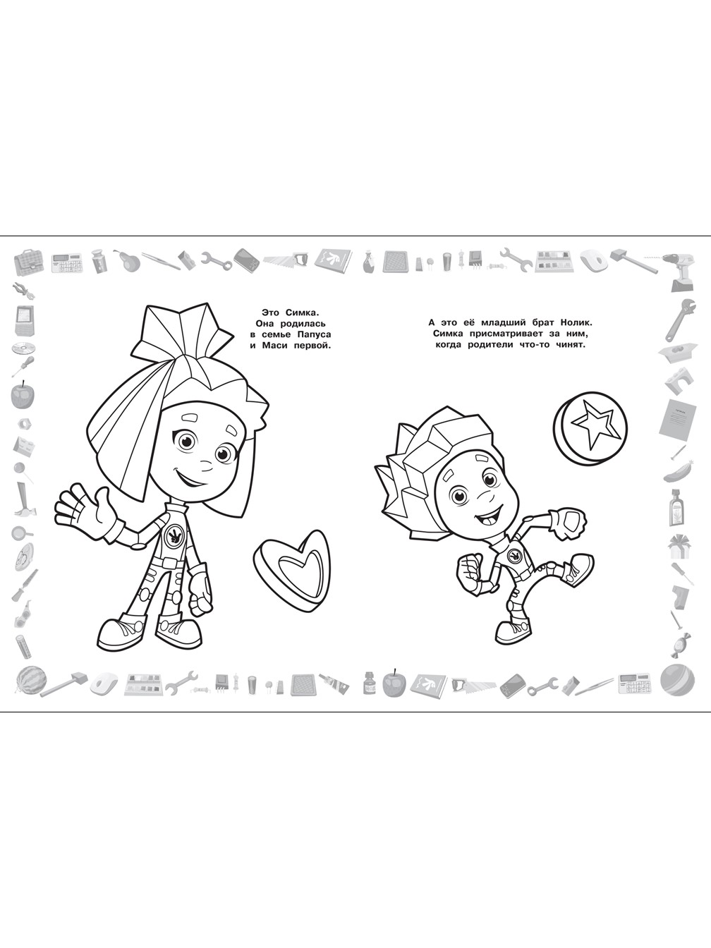 Большая раскраска для ребенка с героями мультфильма Фиксики: Симка, Нолик, Файер, Игрек, Шпуля, Верта, Мася, Дедус, Папус. Плотная бумага, четкий контур рисунков. Фигурки для вырезания на обороте раскраски: Игрек, Симка, Мася. Вырежи фигурки и установи их на подставку.