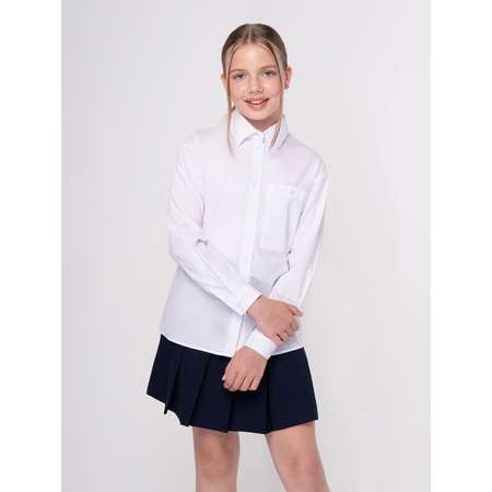 Классическая белая блузка для девочки из смесового хлопка с отложным воротником на стойке и длинными рукавами на манжете. Рукава блузки для девочек декорированы патой и пуговицей позволяющей собрать рукав. Левая сторона полочки дополнена накладным карманом. Застежка центральная на планку с пуговицами. Высокое содержание хлопка в составе обеспечивает отличную воздухопроницаемость и комфорт в повседневной носке. Блузка для девочек школьная будет прекрасным дополнением к моделям из школьной коллекции SMENA. Школьная форма для девочки и школьная одежда для девочек от бренда СМЕНА.