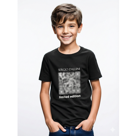 Детская футболка с коротким рукавом и круглым вырезом. Модель выполнена из качественной ткани, состав 100% хлопок. Изображение Q-код.