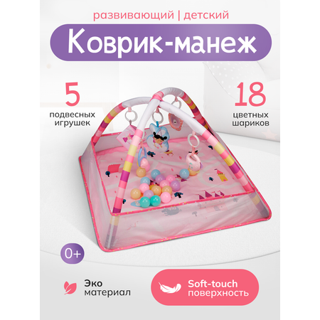 В комплекте 5 подвесных игрушек, 18 мячиков. Поверхность коврика легко чистится, а при необходимости его можно даже постирать.