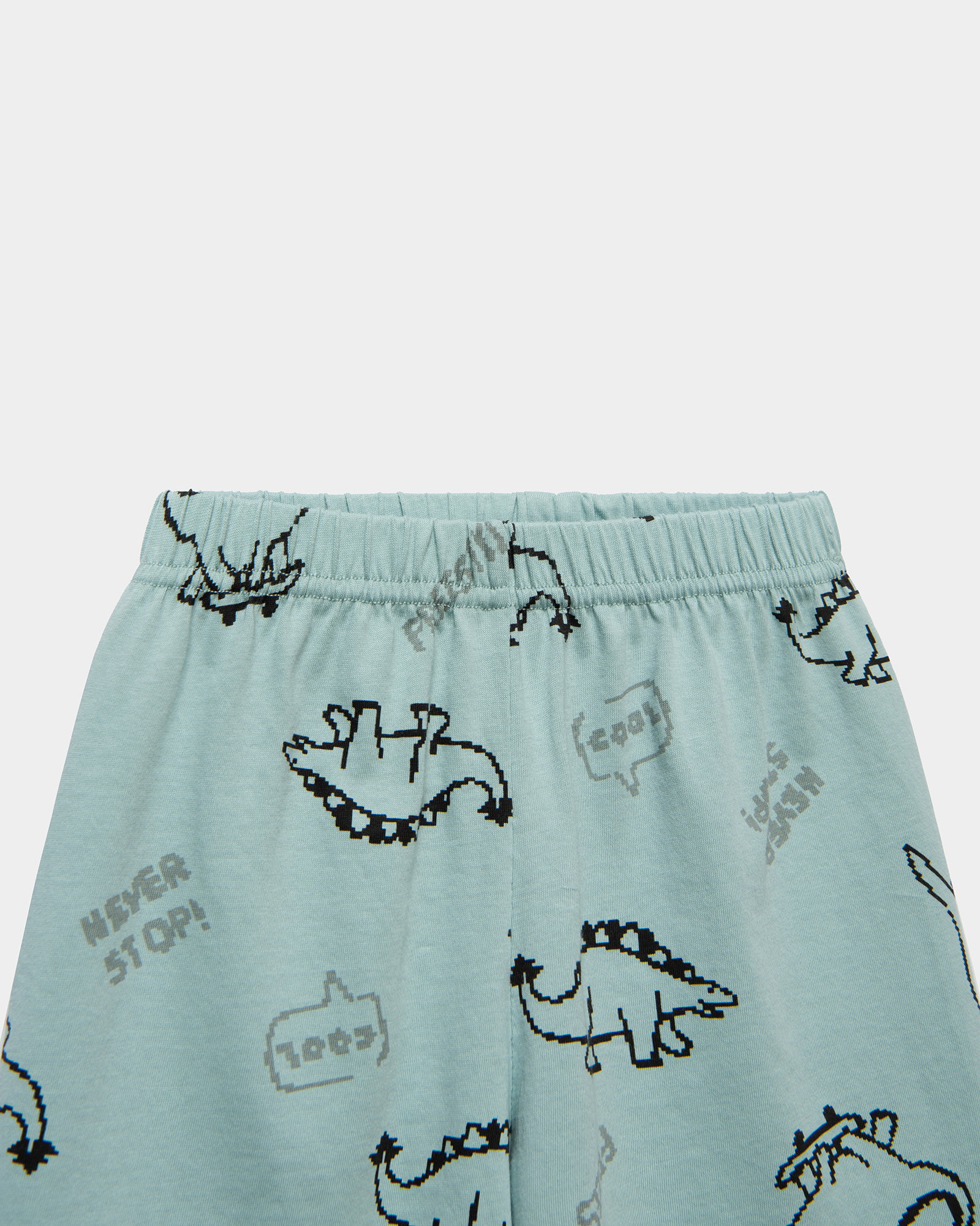 Пижамный комплект для мальчика Day and Night из шорт и футболки мятного цвета, декорированных принтом с динозаврами.
