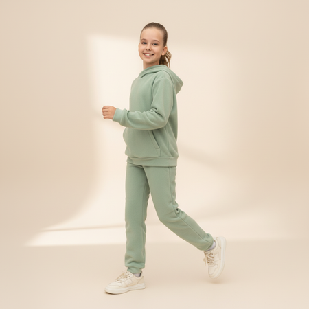Он легкий, дышащий и отлично сидит на фигуре, подчеркивая активный образ ребенка. Толстовка с капюшоном и с карманом-кенгуру. Низ и рукава на манжете. Брюки (брючки) имеют эластичную резинку, которая позволяет им хорошо облегать телу без давления на живот. Это обеспечивает комфортное ношение в течение всего дня. Костюм сшит в однотонном цвете.
