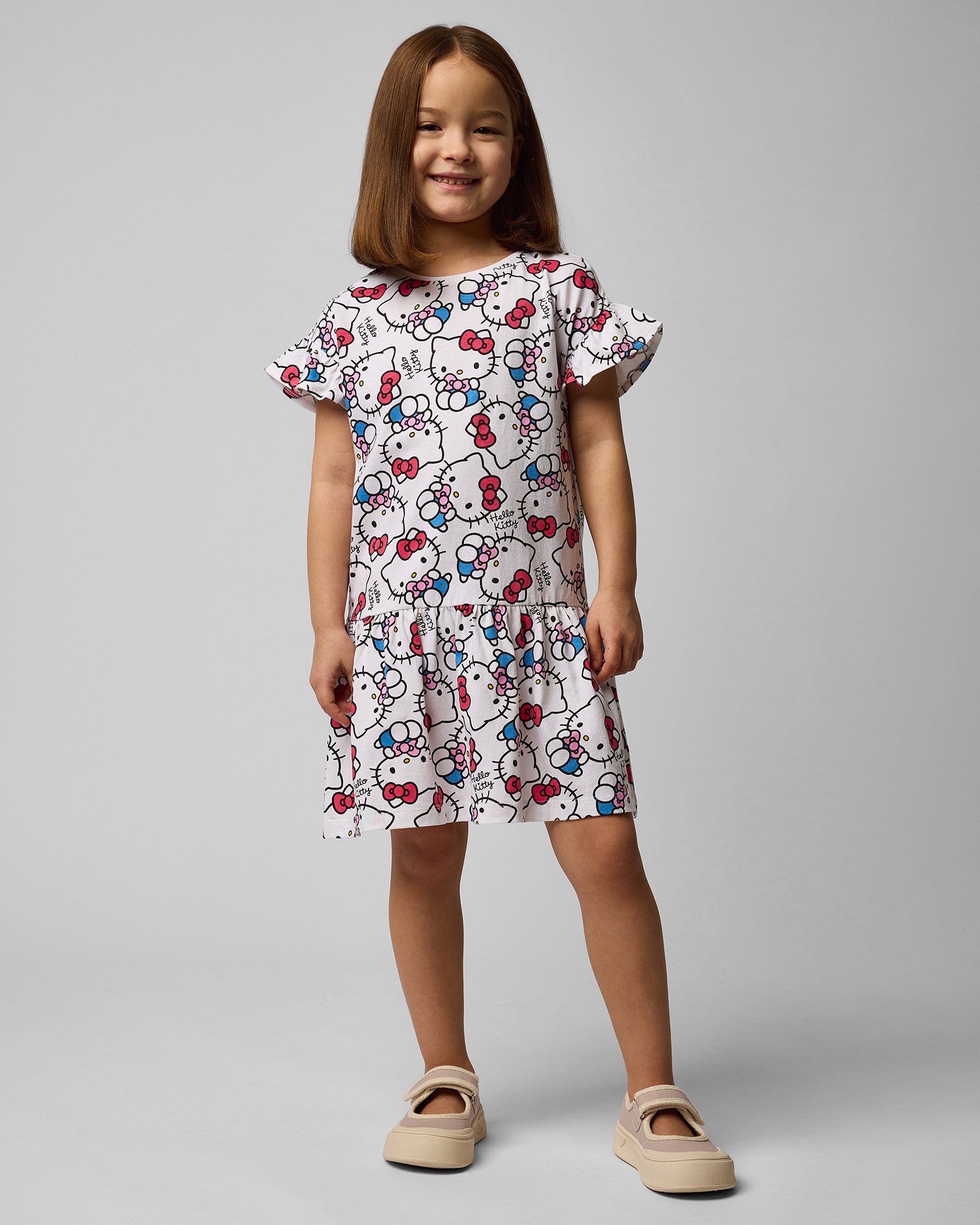 Платье для девочки Hello Kitty с цветным принтом и оборками на рукавах.