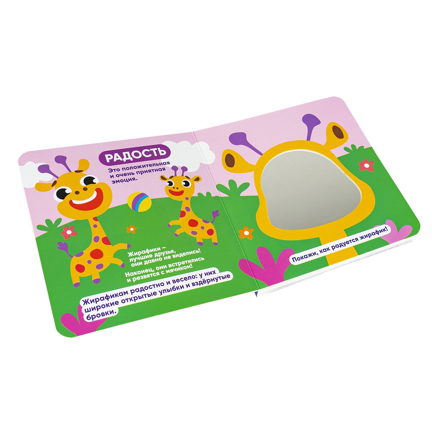 На одном развороте изображены забавные животные, которые испытывают ту или иную эмоцию, а на другом развороте находится зеркало, при помощи которого Ваш ребенок сможет эту эмоцию повторить. Веселая игра научит детей распознавать и демонстрировать эмоции, разовьет внимательность, любознательность и фантазию.