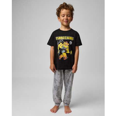 Пижамный комплект для мальчика Турбозавры из чёрной футболки с цветным принтом и серых брюк с однотонным принтом.