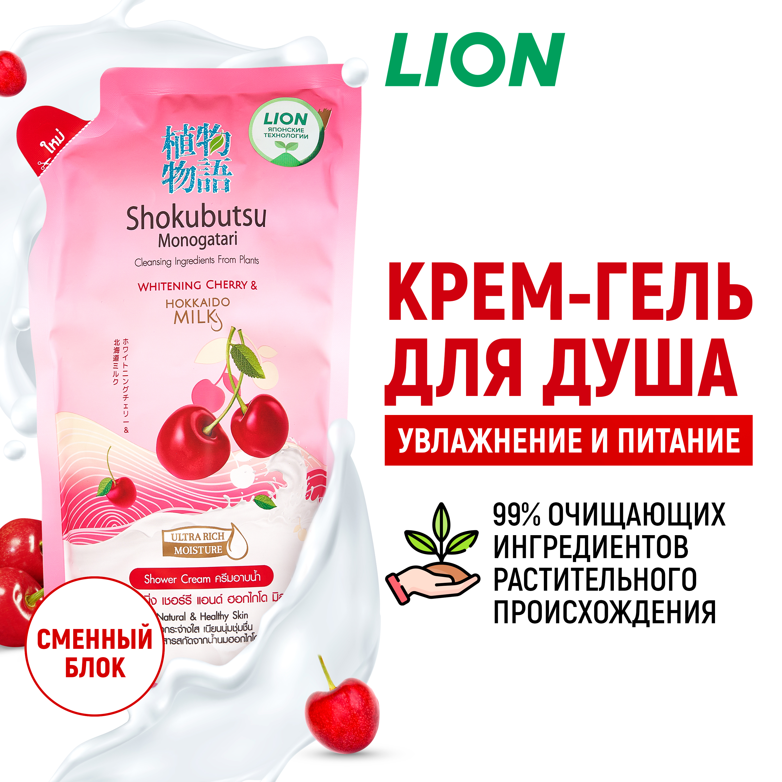 LION Shokubutsu Monogotari Крем-гель для душа Вишня с молоком сменный блок, 500 мл