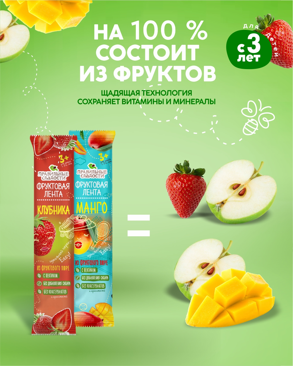 Фруктовая лента с множественным вкусами ассорти в одной упаковке, натуральная без сахара от ТМ Правильные сладости. Натуральные и полезные пастилки «Правильные сладости» со вкусом яблока, яблока-малины, яблоко-банан, клубники и манго, изготавливаются из фруктового пюре без добавления сахара, красителей, консервантов. В 1 упаковке пастилок содержится около 300 г свежих фруктов. Самые спелые фрукты для пастилок выращиваются в благоприятном климате садов Болгарии и перерабатываются там же на собственном заводе кондитерской фабрики. Фрукты томятся в собственном соку, не достигая температуры кипения, сохраняя витамины и насыщенный аромат, поэтому наша продукция имеет короткий срок годности – всего 6 месяцев.