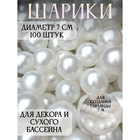 Шарики жемчужные для сухого бассейна 100 штук. Диаметр шарика - 7 см, оптимален для быстрого заполнения бассейна, в отличие от 5 см. Также подойдут для декора (создание жемчужных бус для фотозоны). Изготовлены из гипоаллергенного пищевого пластика. Без отверстий, легко мыть, можно играть с мячиками в воде. Упругие и прочные. Производство - Россия.