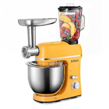 Справится с любой задачей! Многофункциональный планетарный миксер «3 в 1» КТ-3458 поможет вам смешать ингредиенты, взбить яичный белок или сливки. Также он может перемолоть мясо на фарш и смешать фруктовые и фитнес-напитки, молочные коктейли, соусы и детское питание. Долой комочки! Миксер оснащён планетарной системой смешивания: во время работы насадка вращается вокруг своей оси и одновременно движется по окружности по внутреннему объёму чаши, обеспечивая идеальное качество смешивания и ровную консистенцию без комков. Тесто для любого блюда Венчик служит для взбивания яичных белков, сливок, замешивания жидкого теста. Насадка для смешивания используется для негустых ингредиентов, приготовления картофельного пюре. Крюки для замешивания подойдёт для замешивания густого теста. Не фаршем единым Мясорубка в КТ-3458 позволяет не только рубить мясо на фарш разной толщины и делать колбаски с кеббе, но и выдавливать форменные тестовые изделия: печенье, макароны, спагетти и даже тальятелле. Домашний фреш Блендер идеально подходит для смешивания фруктовых и фитнес-напитков, приготовления смузи, протеиновых смесей, молочных коктейлей, супов-пюре, соусов и детского питания. В комплекте с блендером идёт вместительная чаша с мерной шкалой ёмкостью 1,5 литра. Настройка скорости и времени работы Миксер позволяет регулировать скорость от минимума до максимума. При включении миксера скорость вращения увеличивается постепенно, чтобы предотвратить разбрызгивание ингредиентов. У прибора 6 скоростей и импульсный режим. Простое обслуживание Для мясорубки предусмотрены загрузочный лоток с толкателем, чтобы удобно и безопасно подавать продукты в загрузочный блок. Все составные части мясорубки легко мыть и чистить. Невероятная комплектация Вместе с устройством в комплекте идёт широкий ассортимент различных насадок. Чаша миксера объёмом 5 литров позволит замешать ингредиенты на целую семью или большую компанию. Мощность 1400 Вт Ёмкость чаши миксера 5 л Ёмкость чаши блендера 1,5 л Материал чаши нержавеющая сталь Материал чаши блендера стекло Длина шнура 1 м Уровень шума 85 дБ Размер устройства 389 x 240 x 499 мм Размер упаковки 568 x 310 x 395 мм Вес нетто 7,3 кг Вес брутто 8,9 кг Вес брутто 8,9 кг Гарантия - 1 год Срок службы - 2 года
