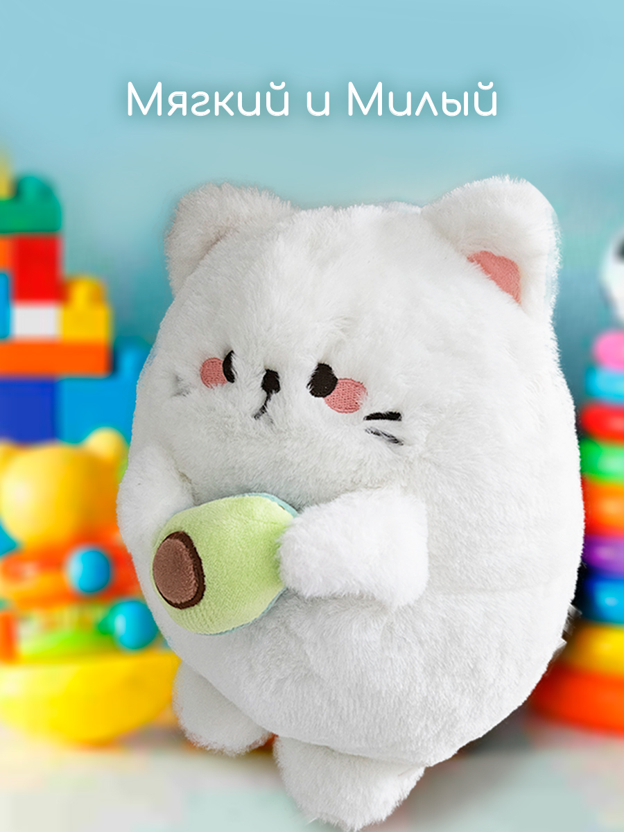 Мягкая игрушка Котик с авокадо - это не просто милый и забавный аксессуар для вашего дома, но и отличный подарок для детей и взрослых.Игрушка выполнена в виде милого белого котика с авокадо, что делает ее уникальной и запоминающейся. Размеры игрушки составляют 27 см, что позволяет комфортно держать ее в руках и обнимать, даже малышам.