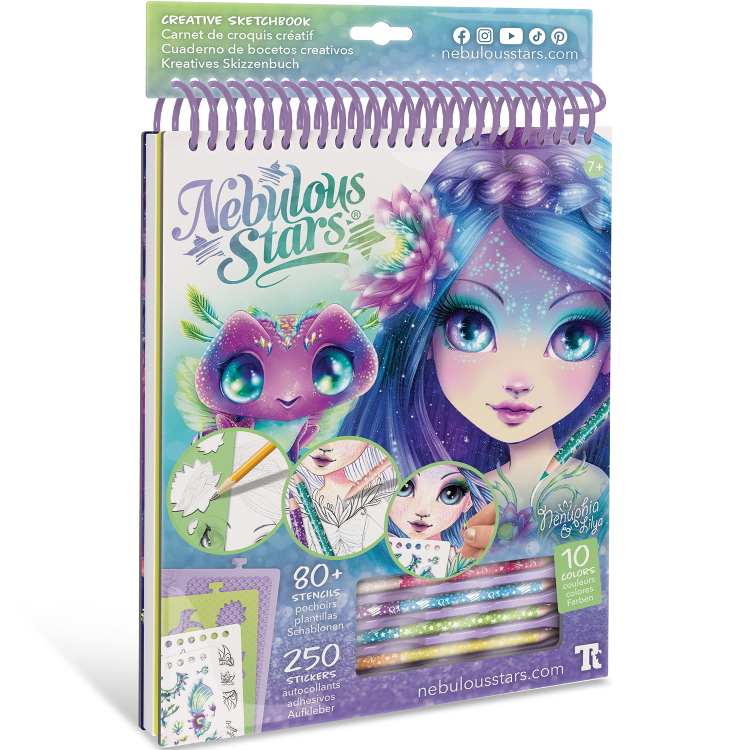 Комплектация: 35 страниц с эскизами, более 80 трафаретов, 3 рисунка для втирания, 250 наклеек, 5 цветных карандашей, 8 техник для рисования, полная история звёздочки Nenuphia, инструкция.