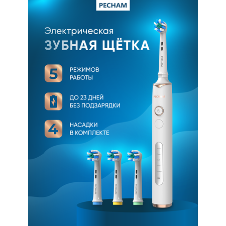 Электрическая зубная щетка PECHAM Oral Care PC-3201, 5 режимов, 4 насадки, отбеливающая, для чувствительных зубов, белая