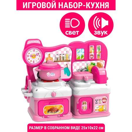 Кухня сборная 26x11x21,5 см. С одной стороны есть функциональная раковина с краном, из которого льётся вода, с другой конфорка и духовка. Ручка-переключатель режимов температуры духовки поворачивается, плита светится и издаёт звуки приготовления пищи. Все шкафчики и ящики открываются и закрываются. Есть игрушечная вафельница и тостер. Опустите в тостер хлеб, через несколько секунд от выскочит обратно, как в настоящем!