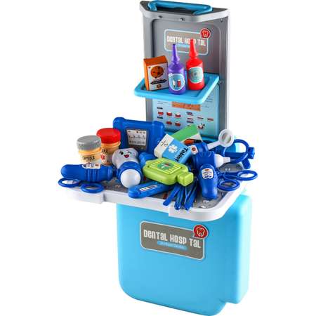 Перед вами игровой набор доктора "Кабинет стоматолога" , который с лёгкостью собирается из чемоданчика до большого смотрового стола. У набора есть 2 положения сборки - высокий стол и компактный размер, который необходимо устанавливать на подставку и можно использовать в любом удобном месте. Кроме того, весь набор трансформируется в чемодан с ручкой, что делает его хранение более компактным и обеспечивает простую транспортировку.