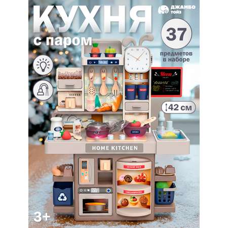Игрушечная кухня выполнена в оригинальном дизайне и стилизована под настоящую кухню. Игровой модуль состоит из плиты с 2 конфорками, крана-помпы для воды и набора из 37 предметов, среди которых: столовые приборы, игрушечные продукты, посуда.