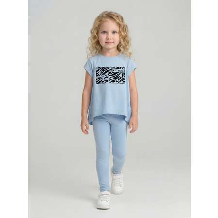 Комплект одежды для девочки KUZA состоит из футболки и лосин. Футболка для девочки с коротким рукавом, силуэт трапециевидный, по переду стильный принт. Перед футболки укорочен. Лосины для девочки облегающего силуэта на эластичном поясе. Комплект для девочки изготовлен из кулирки с эластаном (92% хлопок, 8% эластан), идеально подходит для активного образа жизни вашей маленькой принцессы.