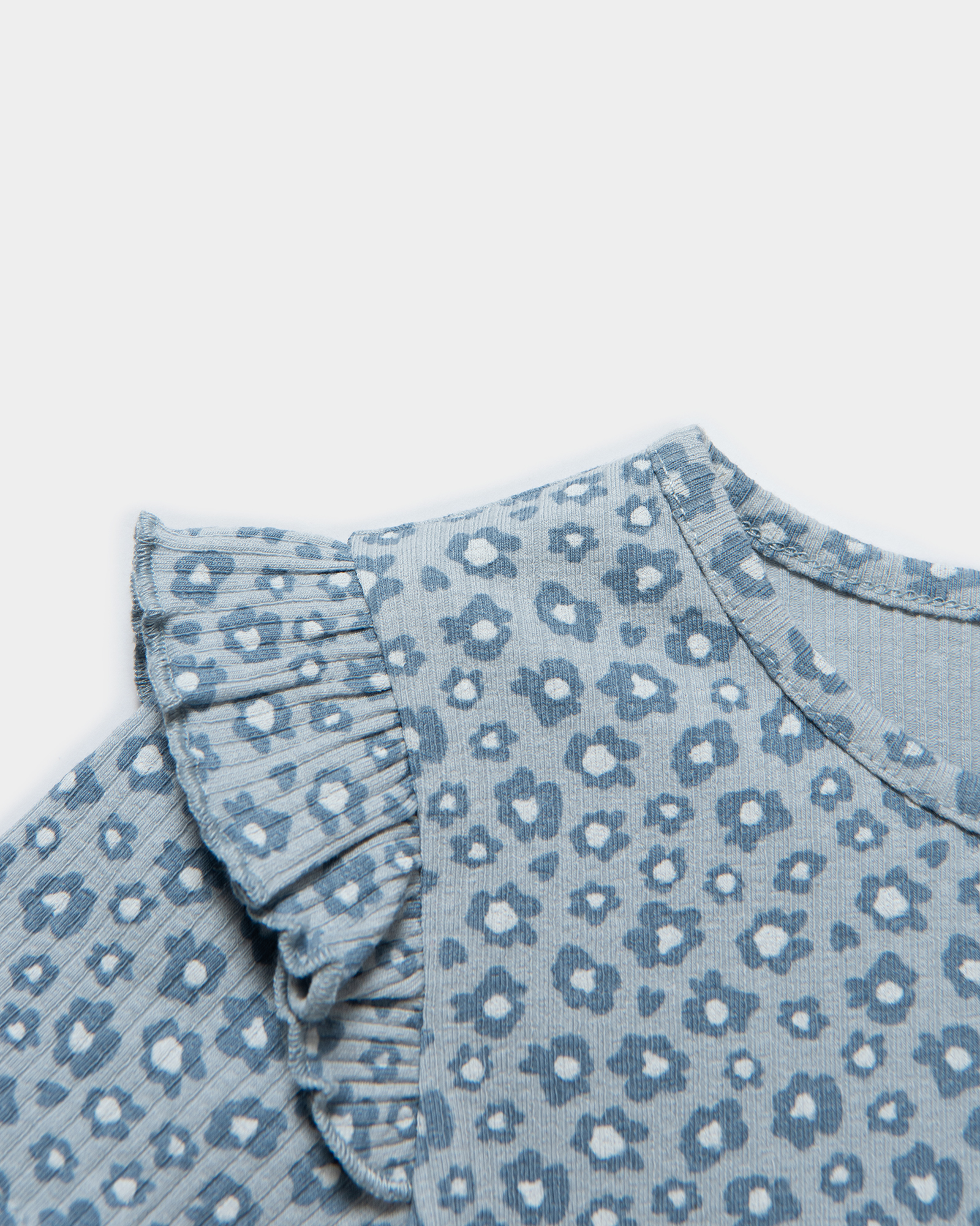 Голубая футболка для девочки Baby Gо с оборками и цветочным принтом.