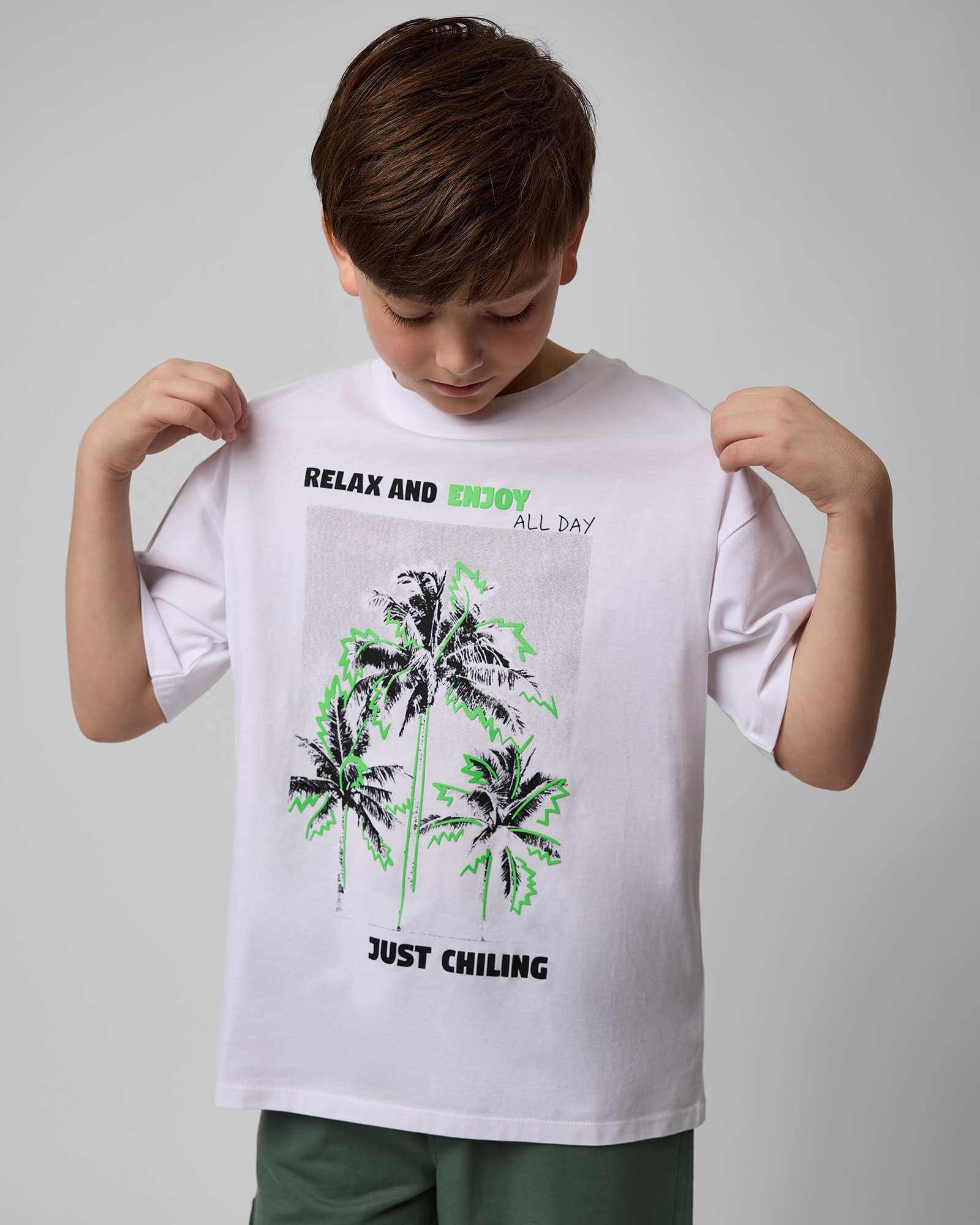 Белая футболка для мальчика Futurino, декорированная ярким принтом с пальмами.