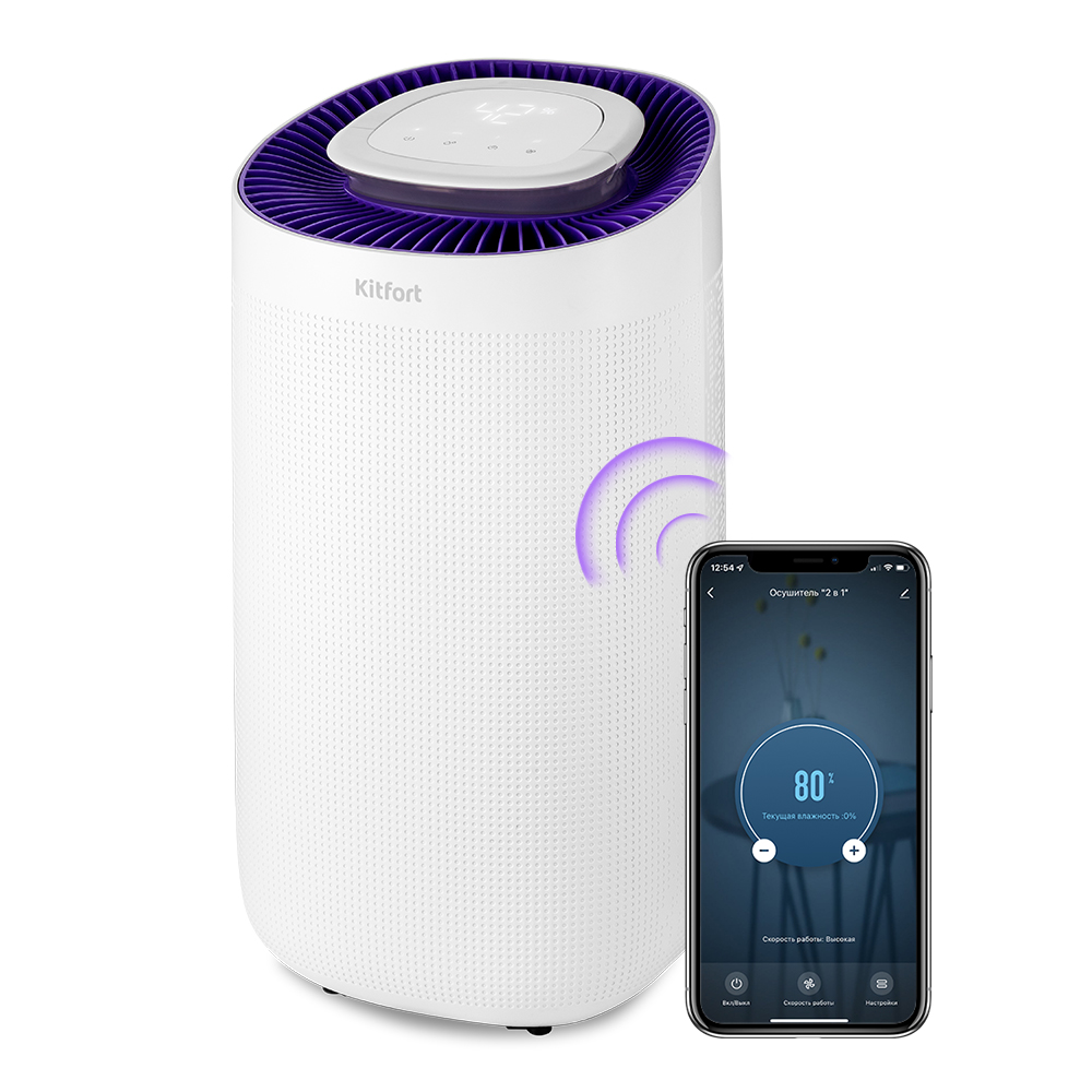 Избавит от влажности в доме! Осушитель воздуха «2 в 1» KT-2843 не только убирает излишки влаги из воздуха, но и очищает воздух от пыли, грязи, шерсти животных, создавая комфортный микроклимат и помогая сохранять ваше здоровье. Осушитель прост в эксплуатации и эффективен в работе. Управление со смартфона или на сенсорной панели Управление устройством осуществляется с помощью сенсорной панели управления или дистанционно с помощью приложения Smart Life, которое устанавливается на ваш телефон или планшет. Установите мобильное приложение! Установите мобильное приложение «Smart Life», и с помощью WiFi подключите увлажнитель к вашему смартфону. В приложении вы можете настроить скорость работы, влажность: 40, 60, 80%, таймер, заблокировать панель управления на осушителе. Принцип работы Принцип действия осушителя основан на охлаждении воздуха, в результате чего снижается количество влаги, которое он способен содержать в себе, а ее избыток выпадает в виде конденсата. В KT-2843 применяется хладагент R290—пропан, он экологически безопасен. Фильтр класса F6 в комплекте В комплекте с прибором идёт воздушный фильтр тонкой очистки класса F6. Фильтр препятствует попаданию пыли и грязи в испаритель внутри устройства. Через 2200 часов работы прибор уведомит о необходимости чистки воздушного фильтра и крышки воздухозаборника. Ручка для переноски Осушитель Kitfort КТ-2843 оснащён удобной ручкой, что позволяет легко перемещать и транспортировать его из комнаты в комнату, из квартиры на дачу. Резервуар для конденсата В результате охлаждения воздуха из него выделяется избыточная влага в виде капель конденсата на испарителе. Не забывайте своевременно выливать воду из резервуара, чтобы она не застаивалась. В противном случае на стенках резервуара будет оседать грязь. Оповещение о полном резервуаре Осушитель воздуха Kirfort KT-2843 оповещает, когда резервуар для конденсата заполнится. Ёмкость резервуара для конденсата 3,2 л. Непрерывный отвод конденсата Осушитель воздуха может работать в режиме непрерывного отвода конденсата без использования резервуара для конденсата. Такой режим работы позволяет использовать прибор с наибольшей производительностью — 24 часа в сутки. Ночной режим Прибор оснащен ночным режимом. В этом режиме устройство работает с минимальной скоростью и издает меньше шума, так что осушитель не будет мешать вашему сну. Вес брутто 12 кг Мощность 158 Вт Кол-во скоростей работы 3 Емкость резервуара для конденсата 3,2 л Диапазон рабочих температур 5-35°C Настройка влажности 40, 60, 80% Хладагент R290 Количество хладагента 45 г Уровень шума до 45 дБ Длина шнура 1,5 м Размер устройства 295 х 295 х 560 мм Размер упаковки 323 х 323 х 597 мм Вес нетто 11 кг Вес брутто 12 кг Гарантия - 1 год Срок службы - 2 года