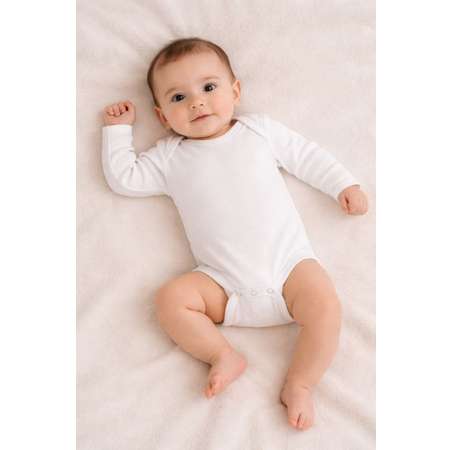 Боди с длинным рукавом на кнопках, выполнен из тонкого 100% трикотажного хлопка (рибана). Плетение нитей в этой ткани менее плотное, чем у другого вида изделий из хлопка, что позволяет комфортно использовать боди в качестве первого слоя. Материал приятный на ощупь, эластичный, гигроскопичный, "дышит" и не вызывает аллергии. Кнопки расположены в нижней части изделия, что облегчает застёгивание изделия на малыше.