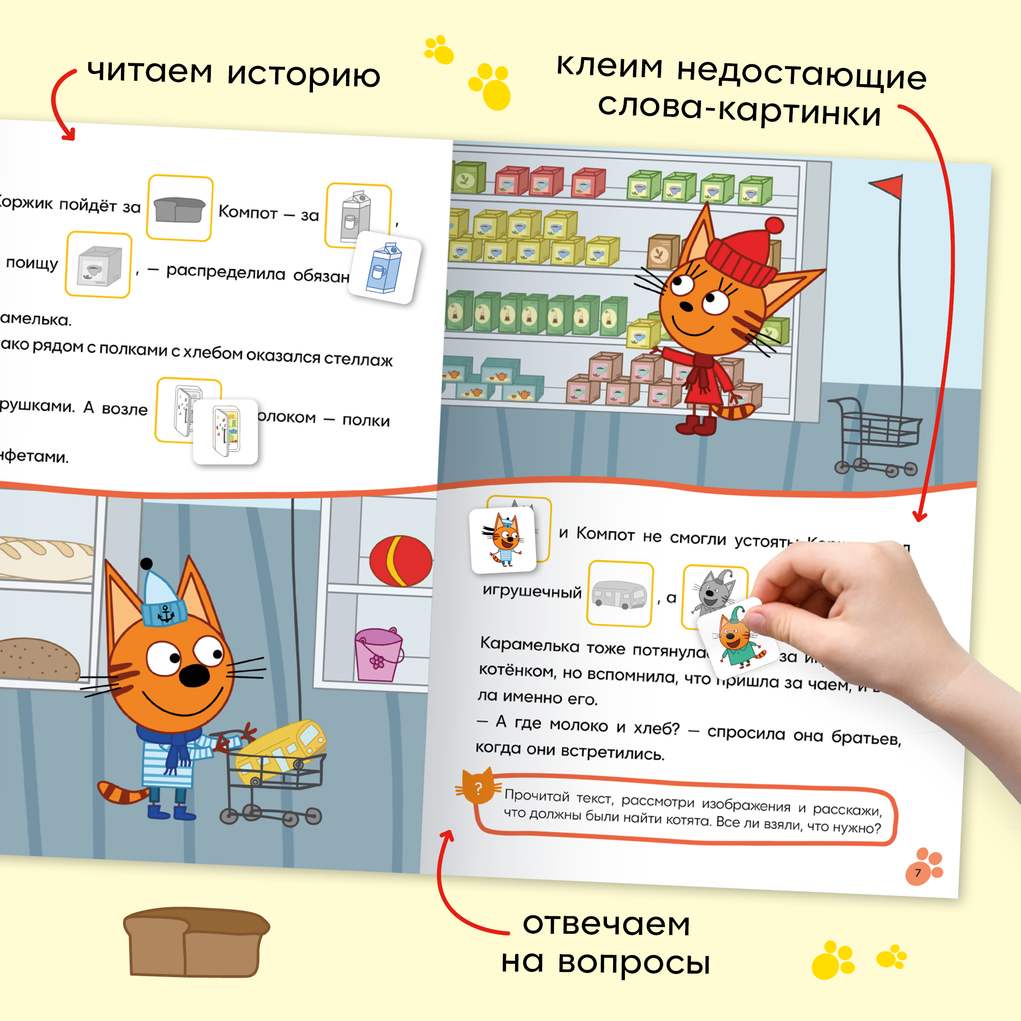 Поход в магазин (Три кота. Читаю сам с наклейками) Книга «Поход в магазин» серии «Три кота. Читаю сам с наклейками» идеально подойдет для обучения чтению, развития речи, мышления и мелкой моторики вашего малыша. Некоторые слова заменены картинками. Приклеивайте яркие наклейки, называйте «пропущенные» слова и читайте любимые истории про приключения котят. Учитесь читать вместе с героями популярного мультсериала «Три кота»!