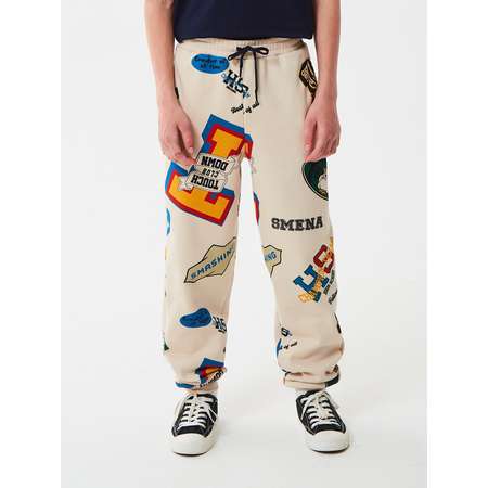 Прямые брюки-джоггеры для мальчика. Модель с эластичным поясом со утягивающим шнурком и мягкими манжетами выполнена из футера. Брюки дополнены аккуратным задним карманом. Стильный принт подчеркнет индивидуальность. Представлены в 2 цветах.