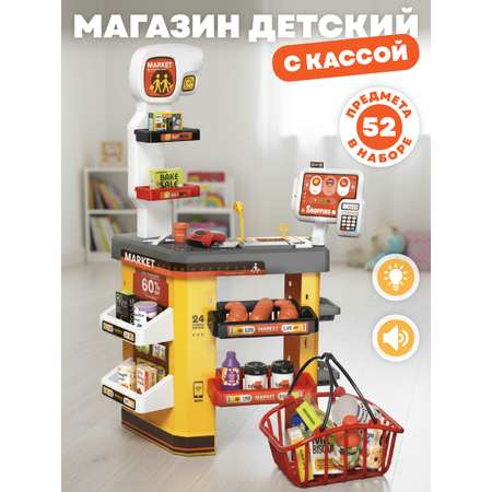 Игровой набор "Супермаркет" для игры в магазин обязательно понравится детям. В комплект входят: большой игрушечный прилавок с вывеской и полочками, касса с игрушечным POS-терминалом и сканером, продуктовая корзинка, всевозможные продукты, а также игрушечная кредитная карта и игрушечные деньги. При проведении картой в POS-терминале и нажатии кнопки на сканере раздаётся звуковой сигнал и загорается световой индикатор. Эти особенности набора добавляют особую реалистичность игре. Игра развивает коммуникативные навыки, воображение, логику, мелкую моторику, а также тренирует навыки устного счета.