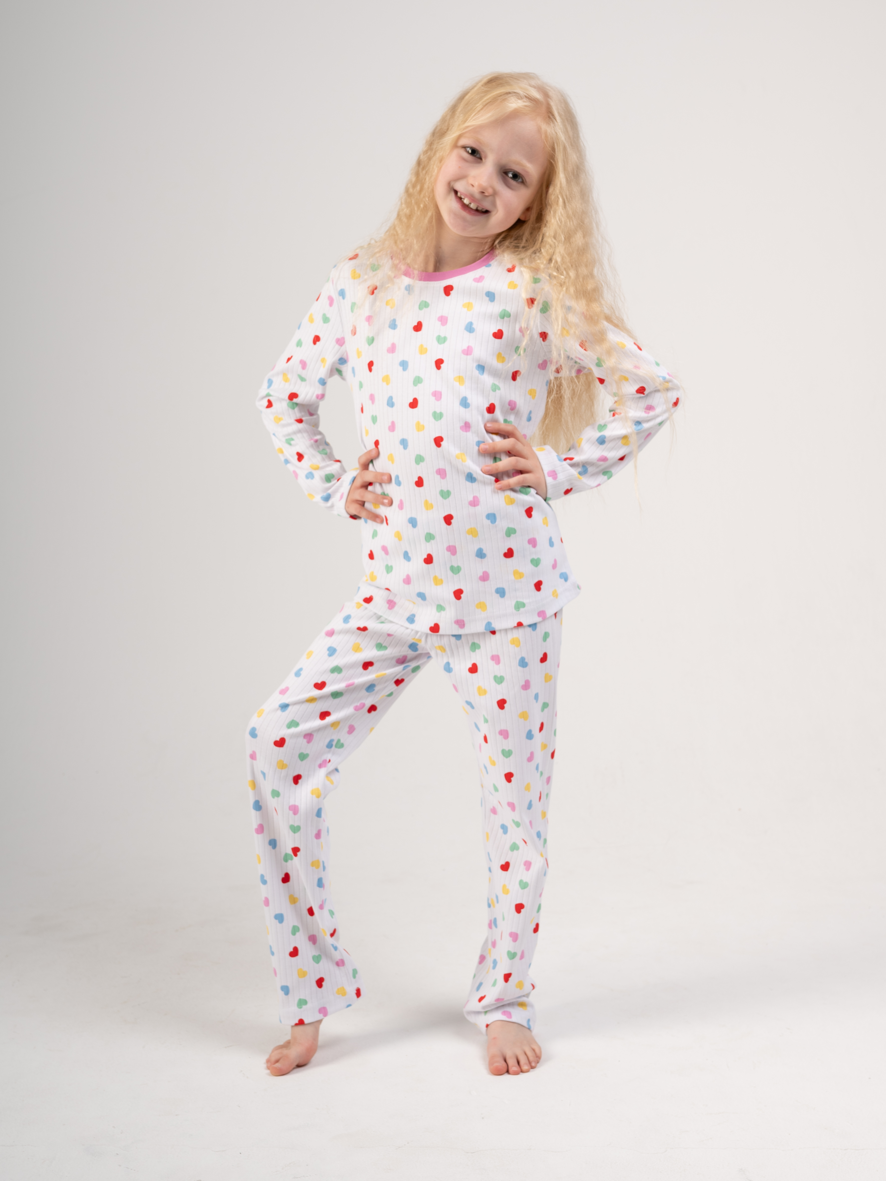 Юная принцесса будет чувствовать себя настоящей королевой в этой милой и уютной пижаме для дома. Она включила всё, что нужно маленькой моднице: удобную футболку с длинным рукавом и округлой горловиной, а также брюки с высокой посадкой. Этот набор создаст идеальное настроение для игр или отдыха. Изделие сшито из натурального турецкого хлопка невероятно плотного, который отличается своей высокой износостойкостью. Материал мягкий, тонкий и легкий, что обеспечивает комфорт на протяжении всего дня или ночи. Внешний вид пижамы подчеркнут стильным нарядом – кофта и штанишки украшены рисунком разноцветные сердечки на белом фоне. Это делает пижаму особенно очаровательной и любимой вещью в гардеробе любой малышки.