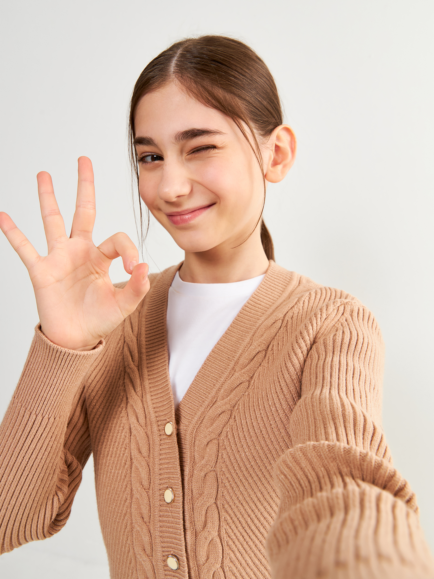 Кардиган на пуговицах для девочки выполнен из мягкой и приятной на ощупь пряжи, которая обеспечивает комфорт и уют в повседневной носке. Модель прямого силуэта, что делает ее универсальной и подходящей для различных случаев. Центральная застежка на пуговицы и петли позволяет легко надевать и снимать кардиган, добавляя функциональности и стиля. Спереди модель украшена декоративной вязкой косы, которая придает изделию изысканность и текстурный акцент. Манжеты по низу изделия и рукавов выполнены в виде эластичных манжет, что обеспечивает хорошую посадку и сохраняет тепло. Этот кардиган станет отличным дополнением к гардеробу девочки, сочетая в себе комфорт, стиль и элегантность.
