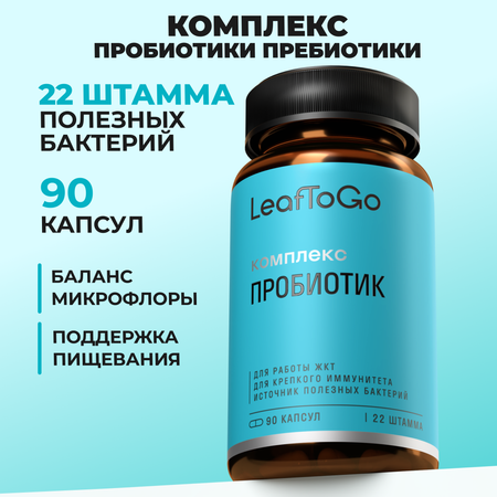Пробиотики и пребиотики для кишечника и желудка для взрослых LeafToGo, 90 капсул — современное средство для поддержания пищеварительной системы. Продукт сочетает пробиотик и пребиотик, обеспечивая комплексную поддержку баланса микрофлоры кишечника, пищеварения и общее укрепление иммунитета. Капсулы содержат высокое содержание пробиотических культур (22 штамма), что способствует восстановлению естественной микрофлоры после приема антибиотиков и помогает организму справляться с последствиями стресса, неправильного питания или сбоя работы жкт.